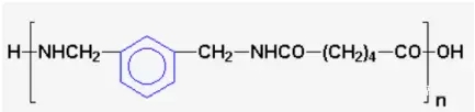 尼龍-mxd6是由三菱氣體化學公司從m-xylenediamine(mxda)生產的廣泛的聚酰胺的通用名稱。它是由間苯二甲胺mxda與己二酸的縮聚而產生的結晶聚酰胺。與尼龍6和尼龍66不同,尼龍mxd6是一種脂肪族聚酰胺,其主鏈中含有一個芳環。化學結構如下: